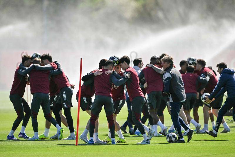 组图:阿森纳备战欧冠比赛 球员抱团顶球